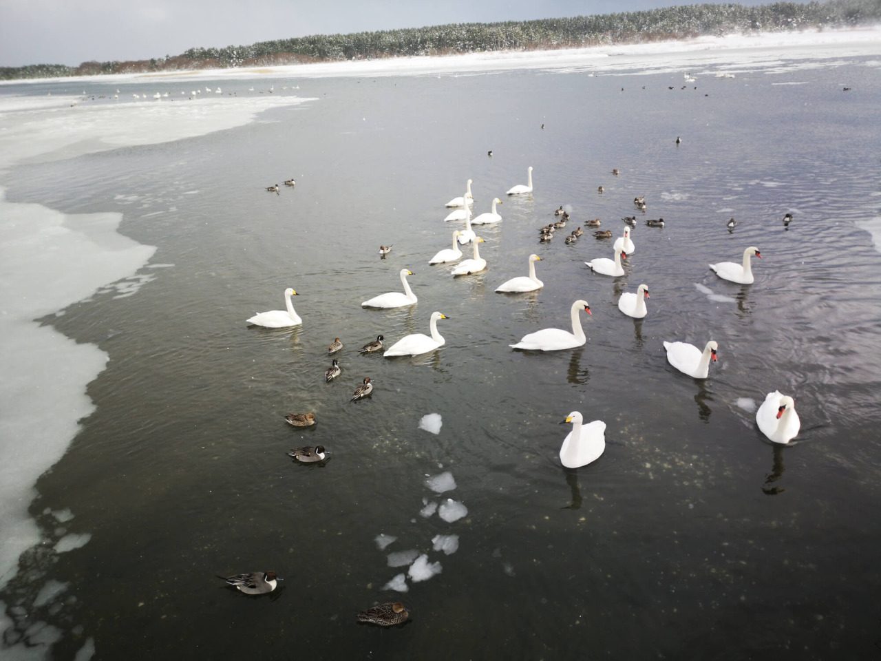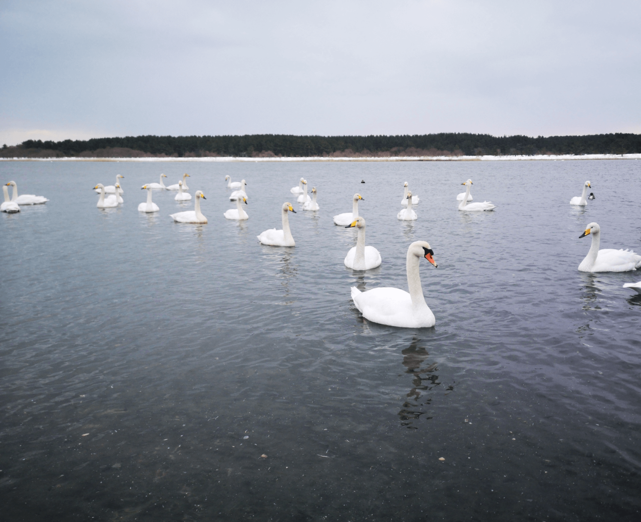 冬になると、多くの白鳥が沼に飛来し、静かに羽を休める優雅な姿を間近で観察できます。凍てつく空気の中で白鳥たちが漂う様子は、訪れる人々に冬ならではの風情と癒やしを届けます。