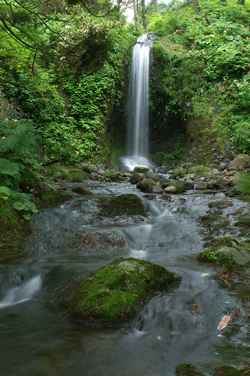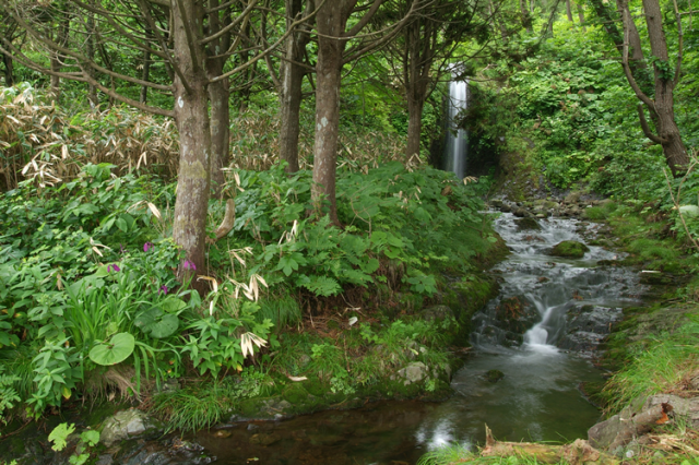 六ヶ所村の泊地区にある落差約6〜7mの「泊の滝」は、海岸からほど近い場所に位置する珍しい滝です。