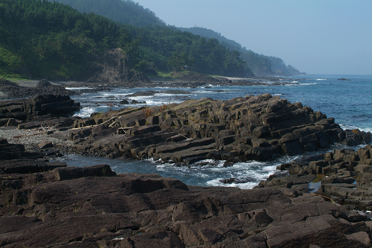 六ヶ所村泊地区にある「タタミ岩」は、その名の通り、平らで規則正しく連なる岩肌がまるで畳を敷き詰めたかのように広がる、海沿いのユニークな自然スポットです。