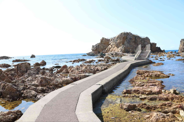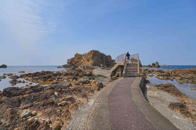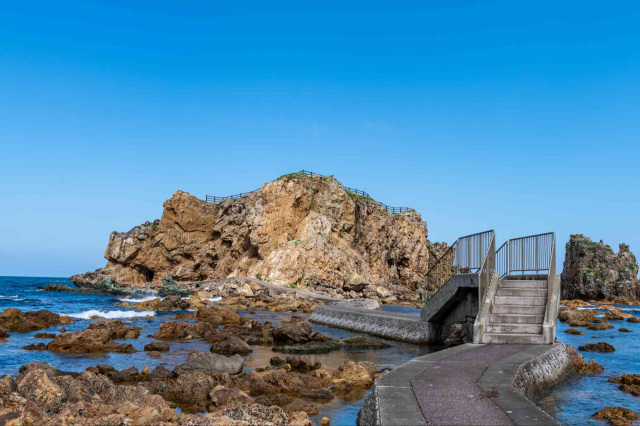 大人が1人通れるほどの洞穴内の階段を登り岩上に出れば、日本海が360度一望できるパノラミックビューが広がります。