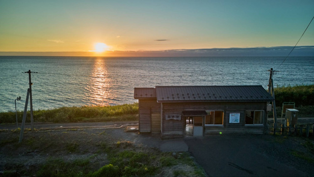 日本海を背に、木造の小さな駅舎がぽつりと佇む驫木駅。