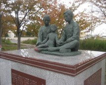 青森県鰺ヶ沢町、海の駅「わんど」駐車場に建つ赤い靴記念像。