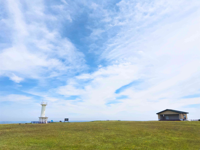 芝生の斜面をゆっくり登った先に広場があり、その奥に草原の中に立つ灯台の姿が現れます。