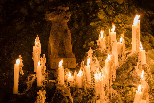 荒々しい岩肌の隙間に灯る無数の炎が、黒い岩の輪郭を静かに浮かび上がらせ、昼とはまったく異なる神秘的な姿を見せます。