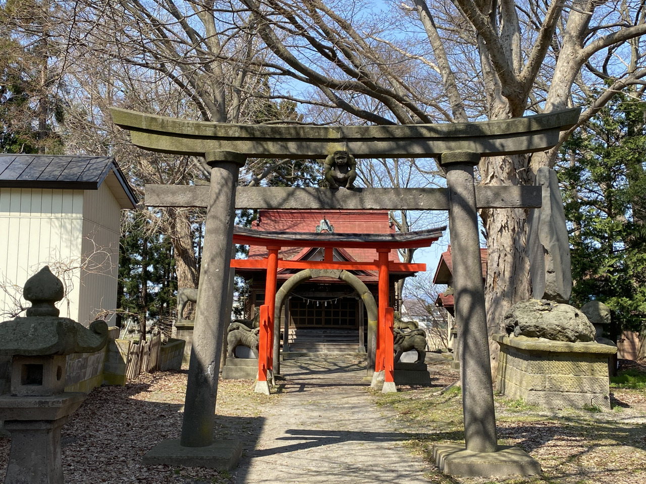 1983年の日本海中部地震では境内の石鳥居の多くが倒壊しましたが、鬼コが乗った鳥居だけが残ったと伝えられています。