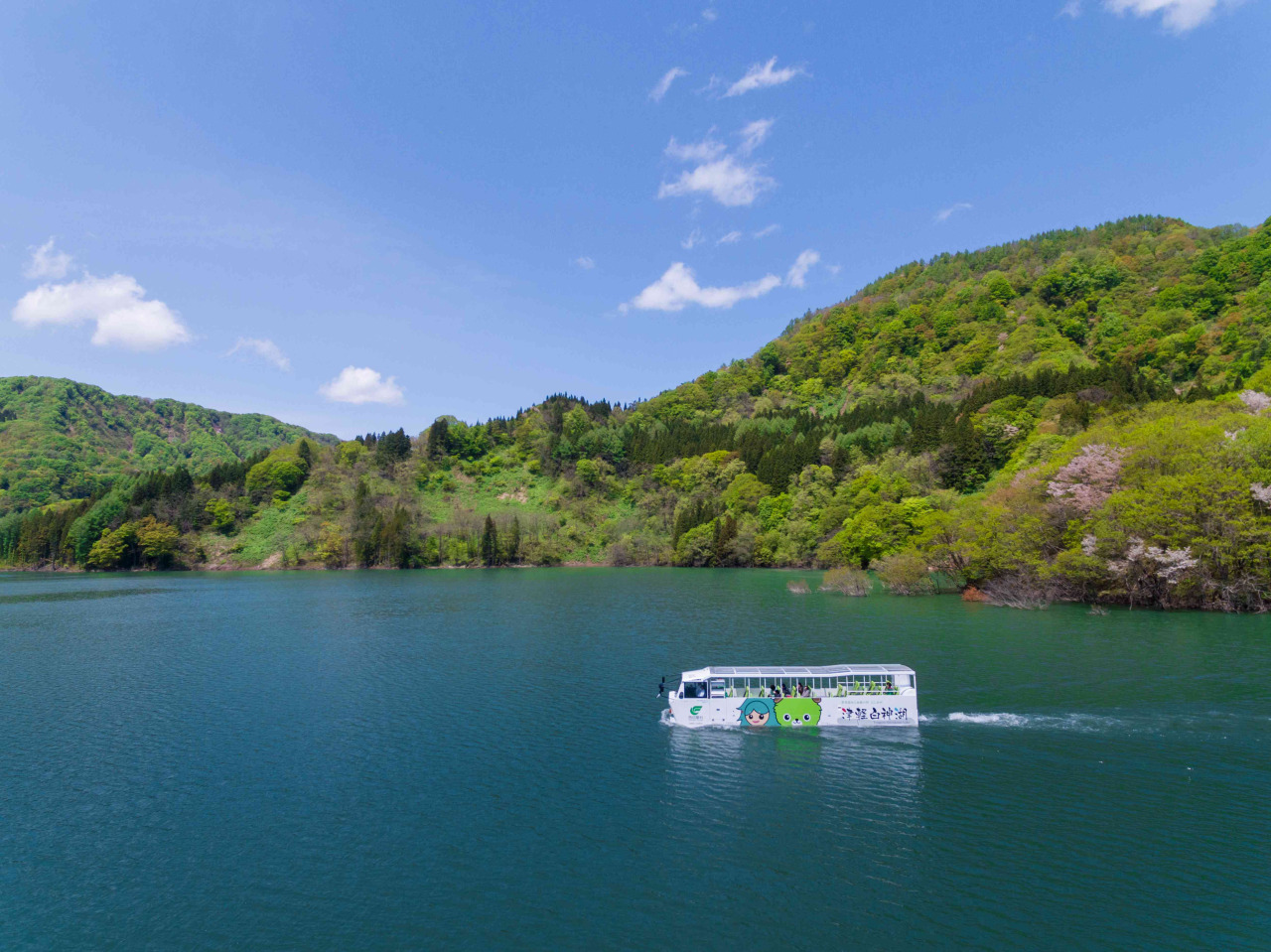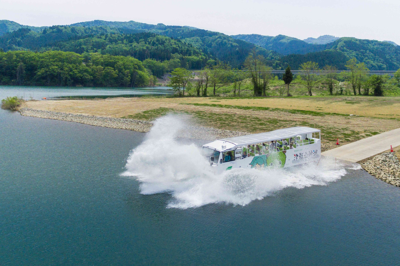西目屋村で体験できる「ニシメヤ・ダムレイクツアー」は、東北初の水陸両用バスに乗り、村内ドライブと津軽白神湖の湖上遊覧を楽しむ体験型ツアーです。