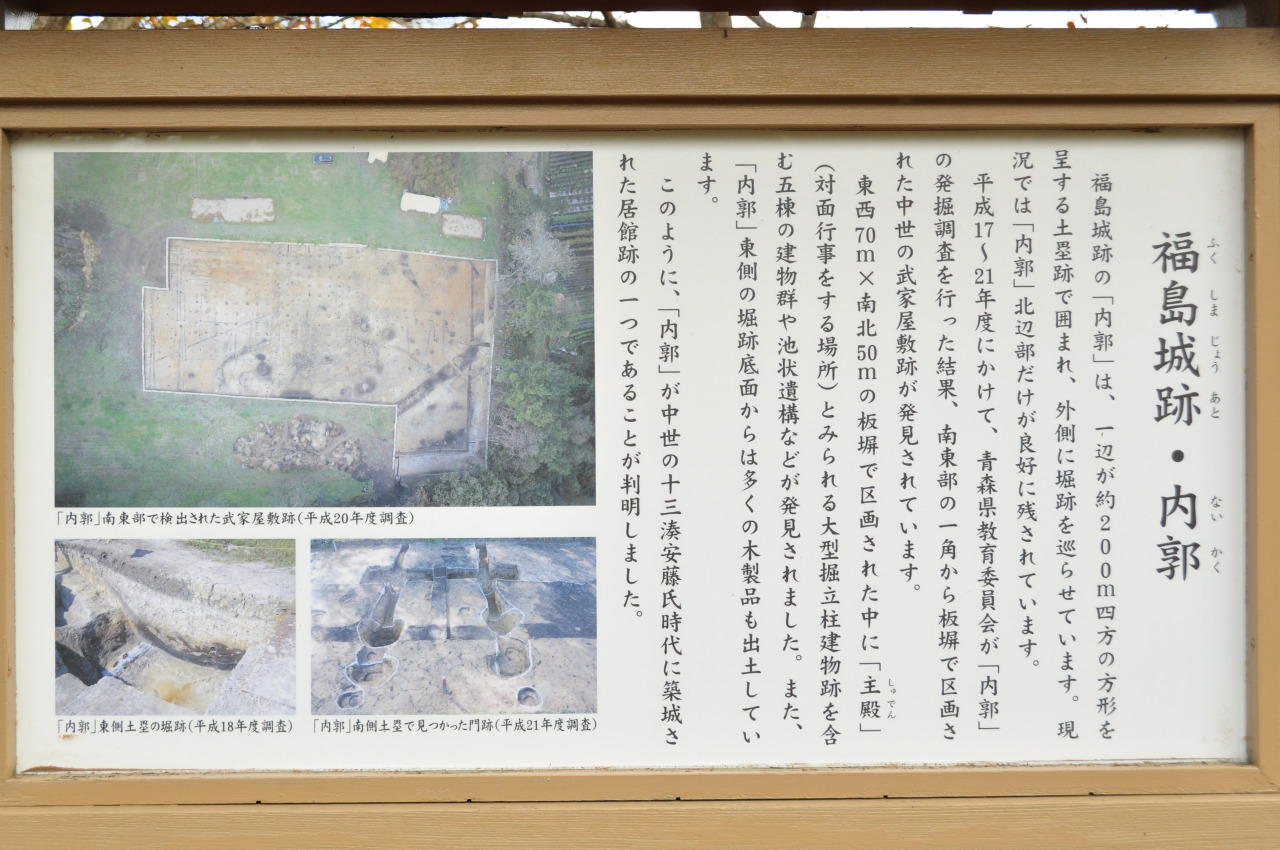 福島城の本格的な学術調査が平成17~21年に青森県教育委員会によって行われています。外郭東土塁・東門や内郭といった福島城に直接関係する城郭遺構について重点的に発掘調査が行われた結果、これらの城郭遺構が14世紀後半から15世紀前半に機能していたことが明らかとなり、福島城は中世港湾都市・十三湊が機能した同時代の安藤氏による城館であることが判明しました。