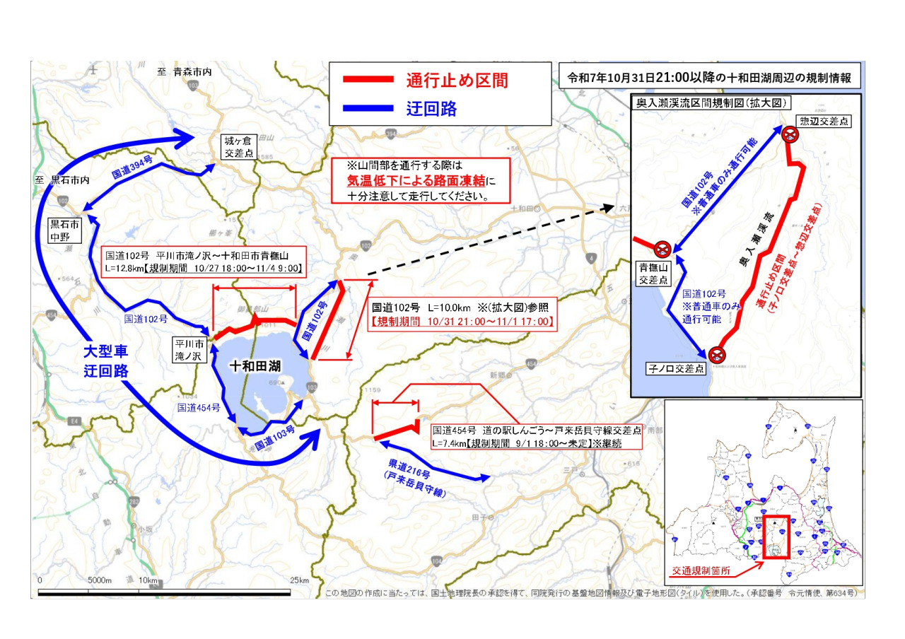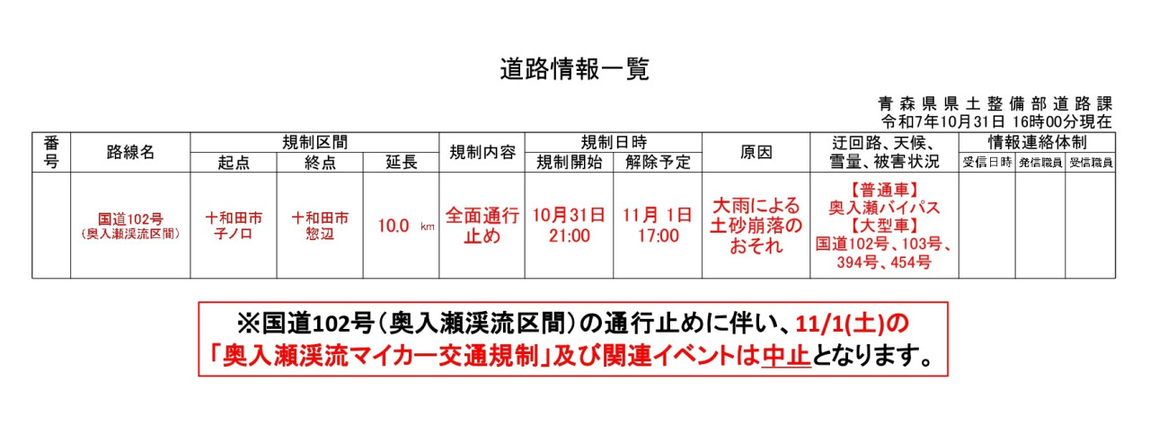 国道102号の子ノ口~惣辺間が大雨による土砂崩落の恐れのため本日21時から全面通行止になります。 これに伴い、同区間の奥入瀬渓流歩道も通行止めになります。