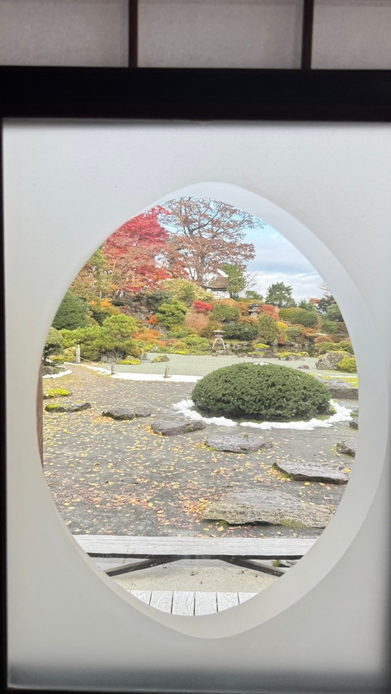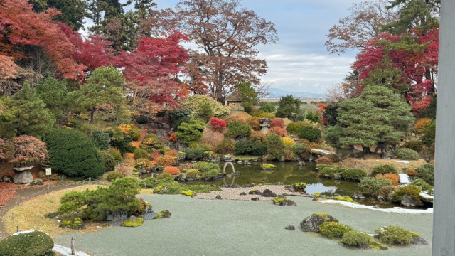 若從洋館遠望,庭園中央豁然開展,並將津輕平原的田園風光與遠方群山借作背景,展現出遼闊壯麗的景觀。