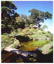 庭園的構成以池塘為中心,分為「真」、「行」、「草」三個部分。
