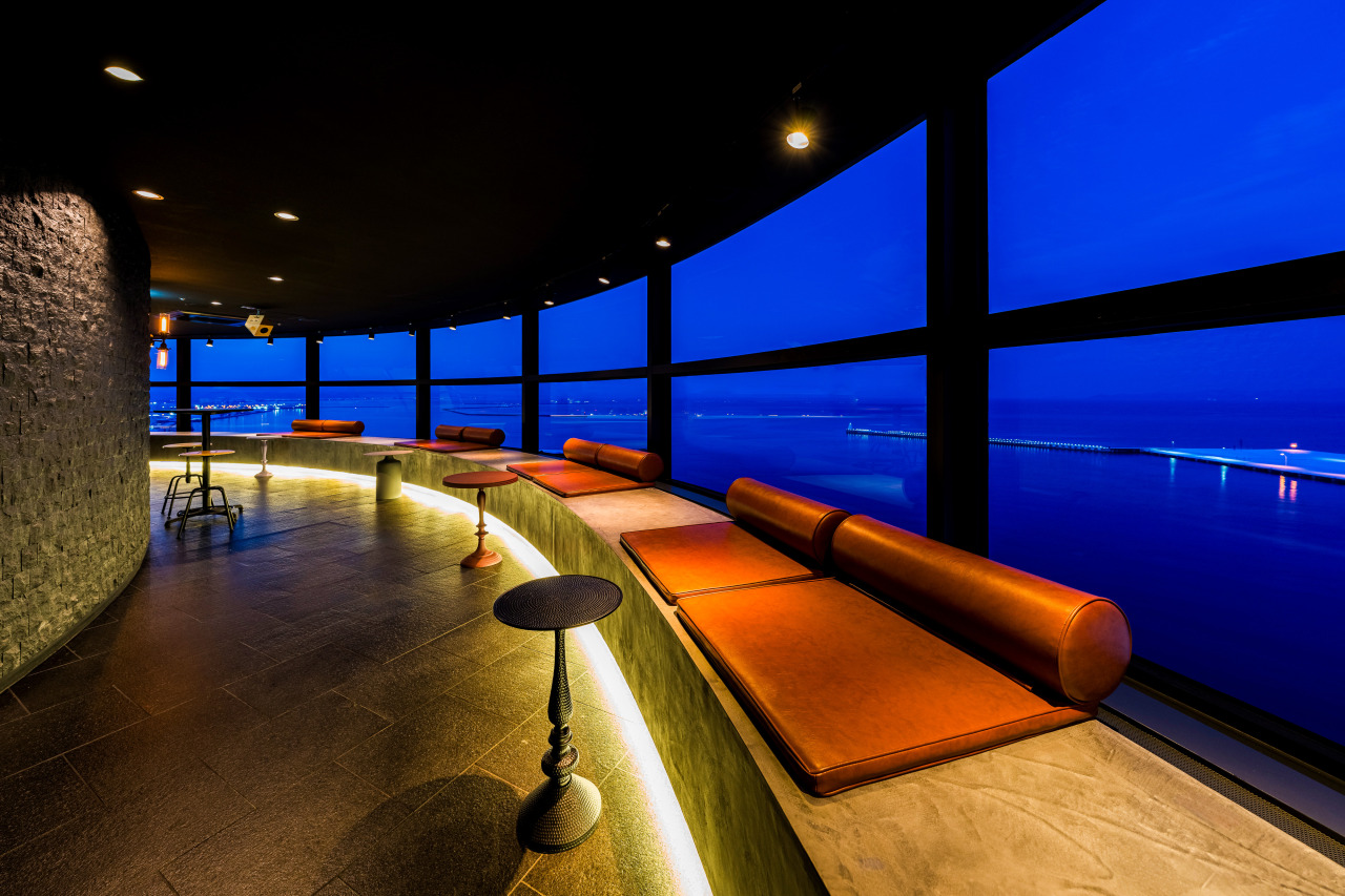 這間酒吧在柔和燈光包圍下,呈現出沉穩放鬆的氣氛,整體為圓形設計,可360度眺望整個青森市,腳下展開的是市區璀璨動人的夜景。